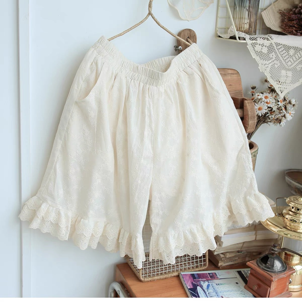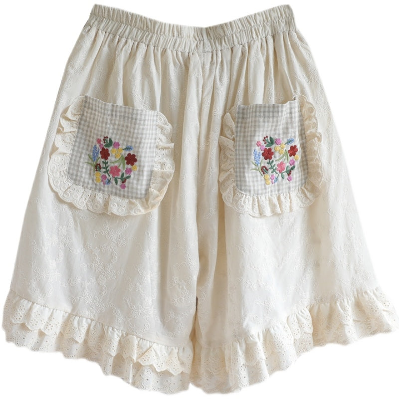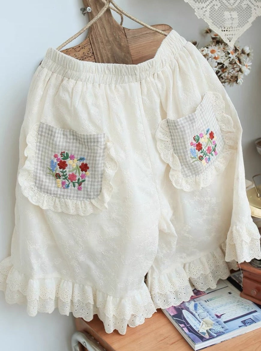 Cute Embroidered Pockets Lace Trim Lined Shorts