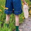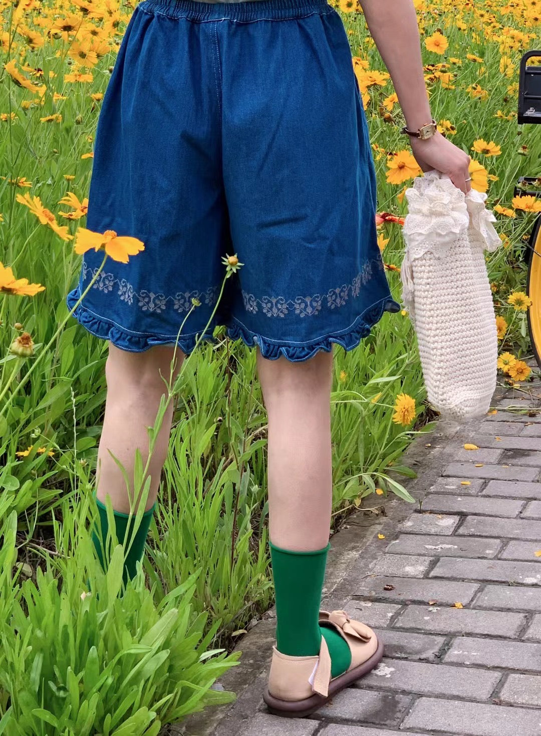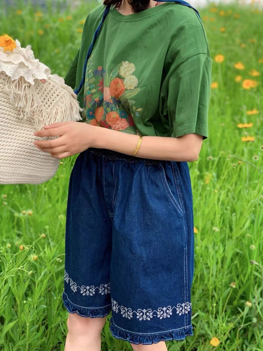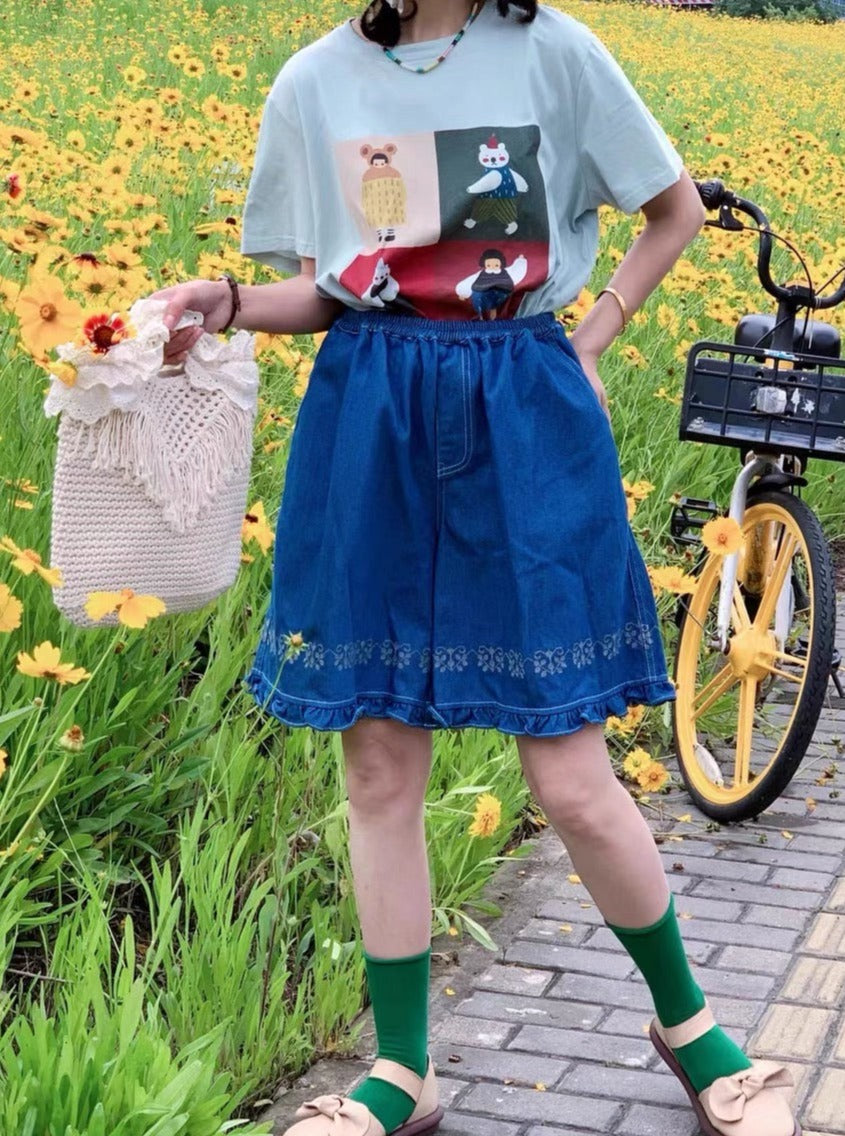 Jacquard Frilled Hem Denim Shorts