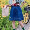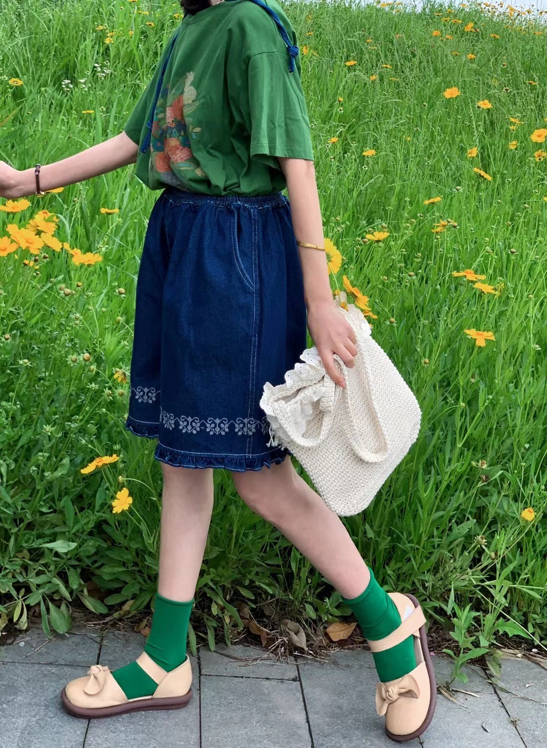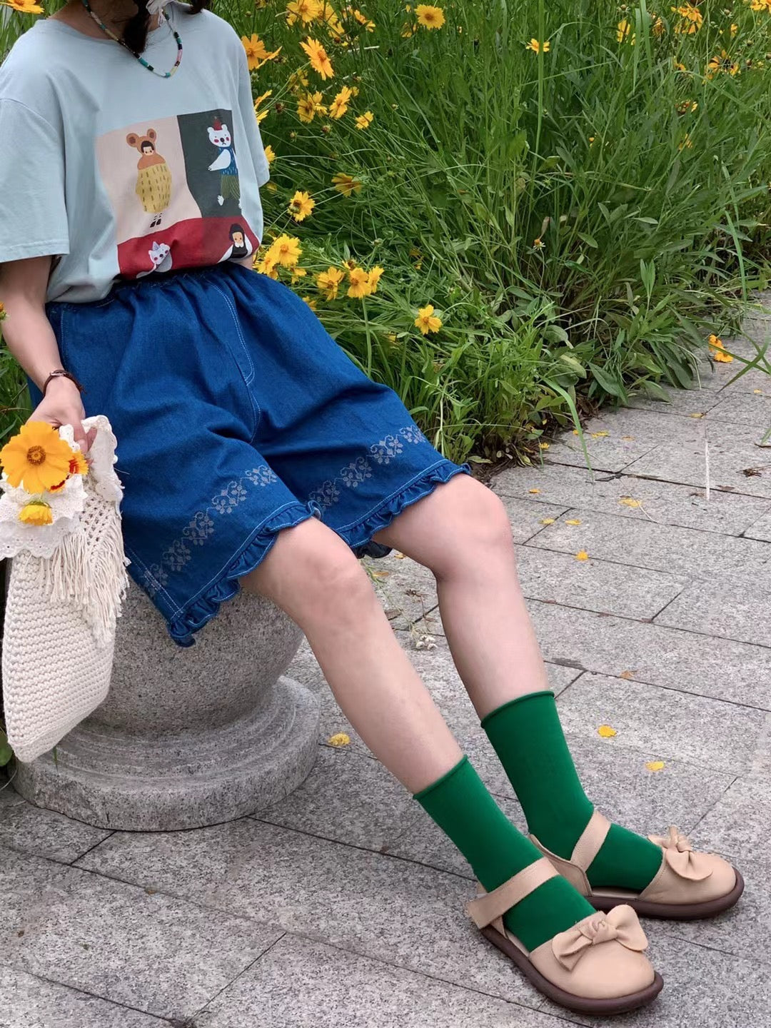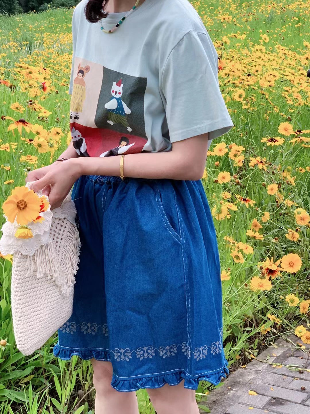 Jacquard Frilled Hem Denim Shorts
